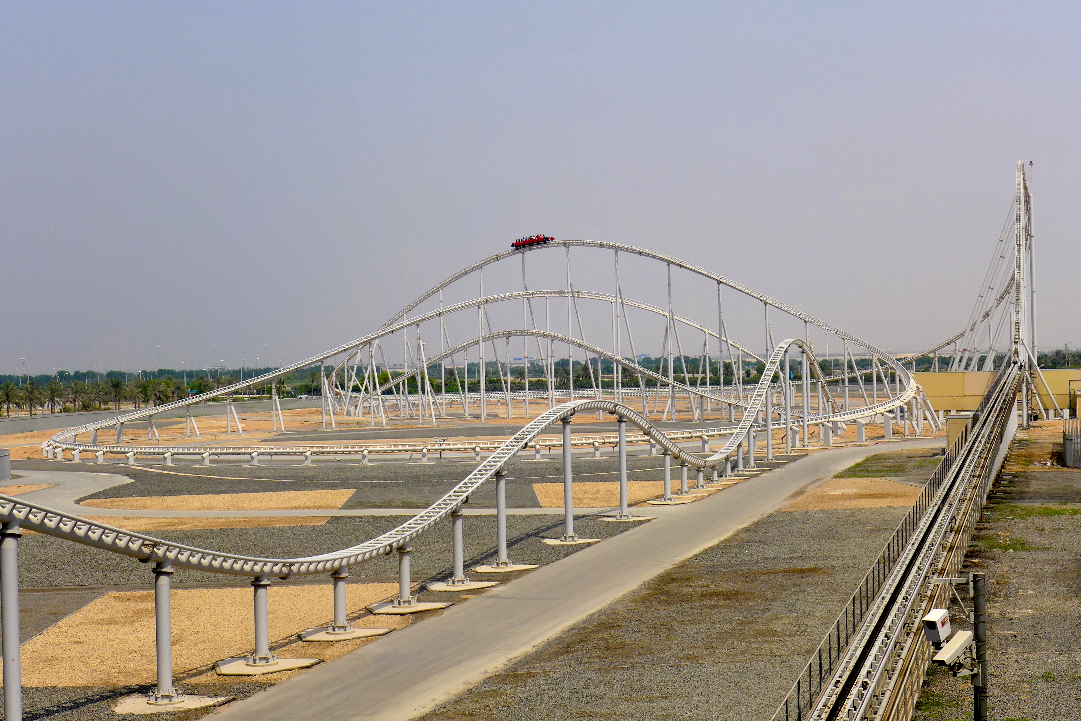 Now I don’t know which part of ‘largest indoor theme park’ I didn’t get, but I actually made the kids put sunblock of their faces before we even left the flat! We’ll just call it a reflex action. It takes about an hour to get to Abu Dhabi and the scenery along the way is basically desert and in case you miss it, more desert. As you can imagine, Ferrari World is massive with the infamous Ferrari red everywhere. How they keep the temperature in such a big space at a cool 24ºC is beyond me but it means you can visit all year round, regardless of how scorching the outside heat is.